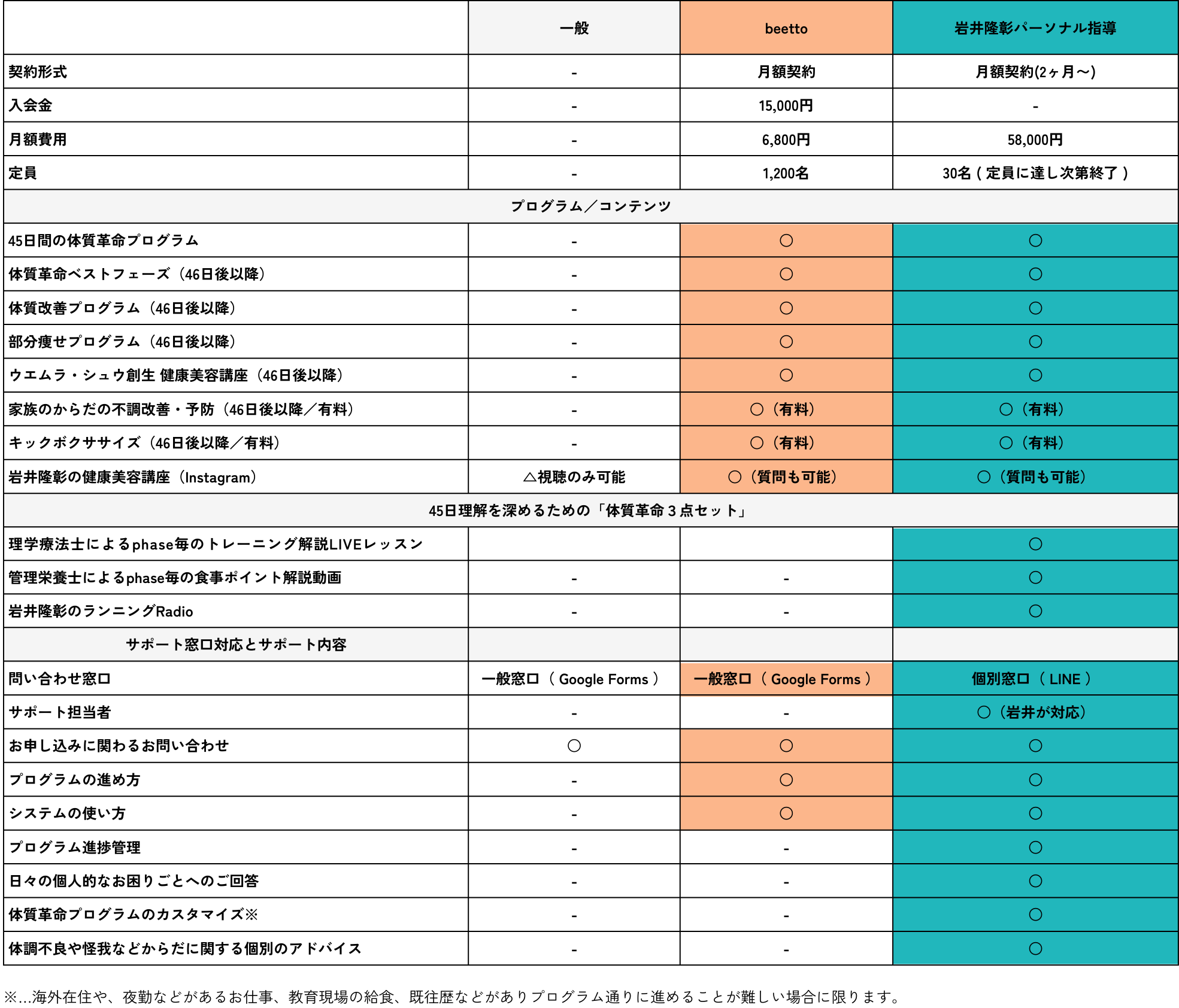 ・サポート期間中は、beettoプログラムについてのみではなく、ご自身の身体のお悩みにもお答えしますのでご相談ください。