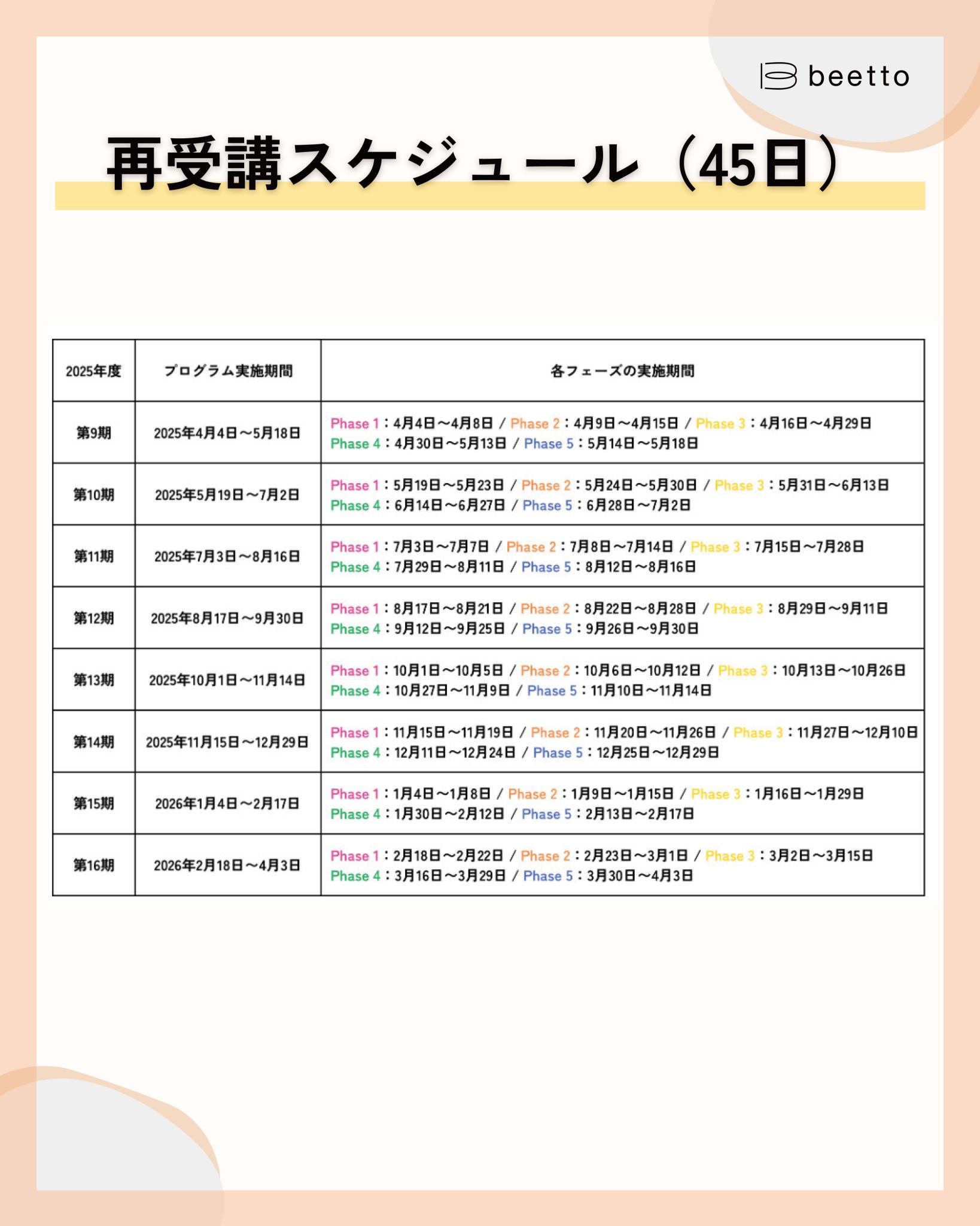 45日間の体質革命プログラムをもう一度受講したい方は、もちろん何度でもご参加いただけます!