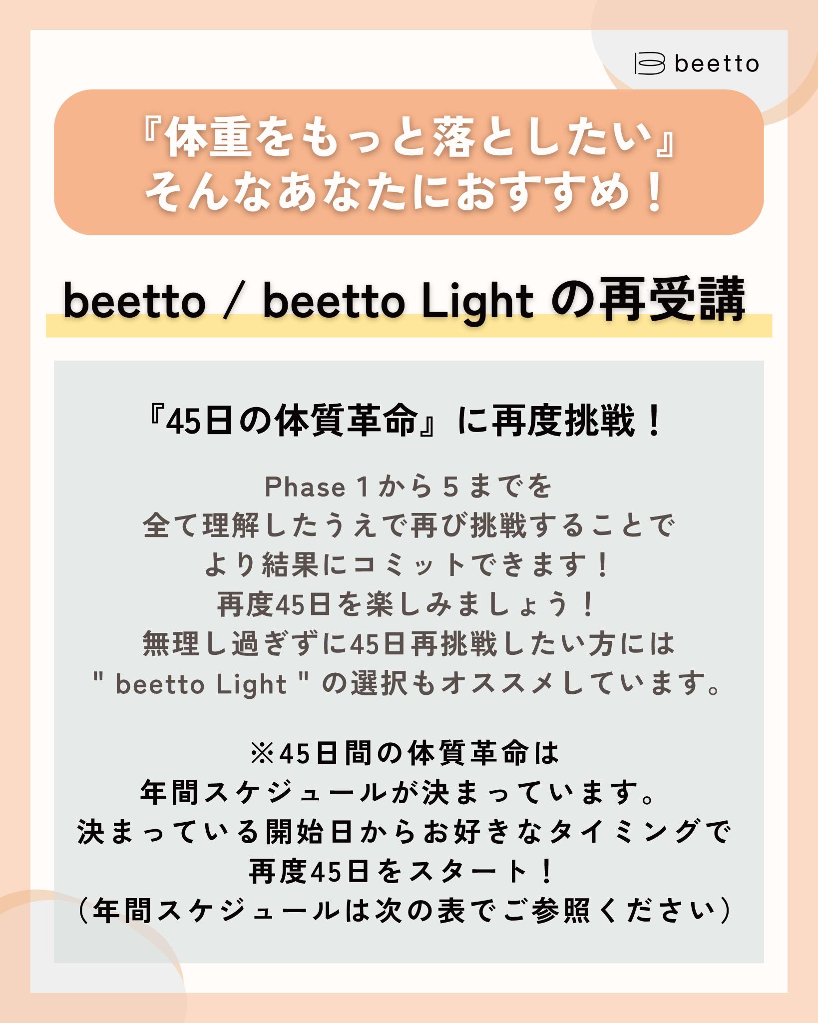 ※ 食事内容につきましては、体質改善プログラム開始前にbeetto公式LINEにて詳しく見ることができます。