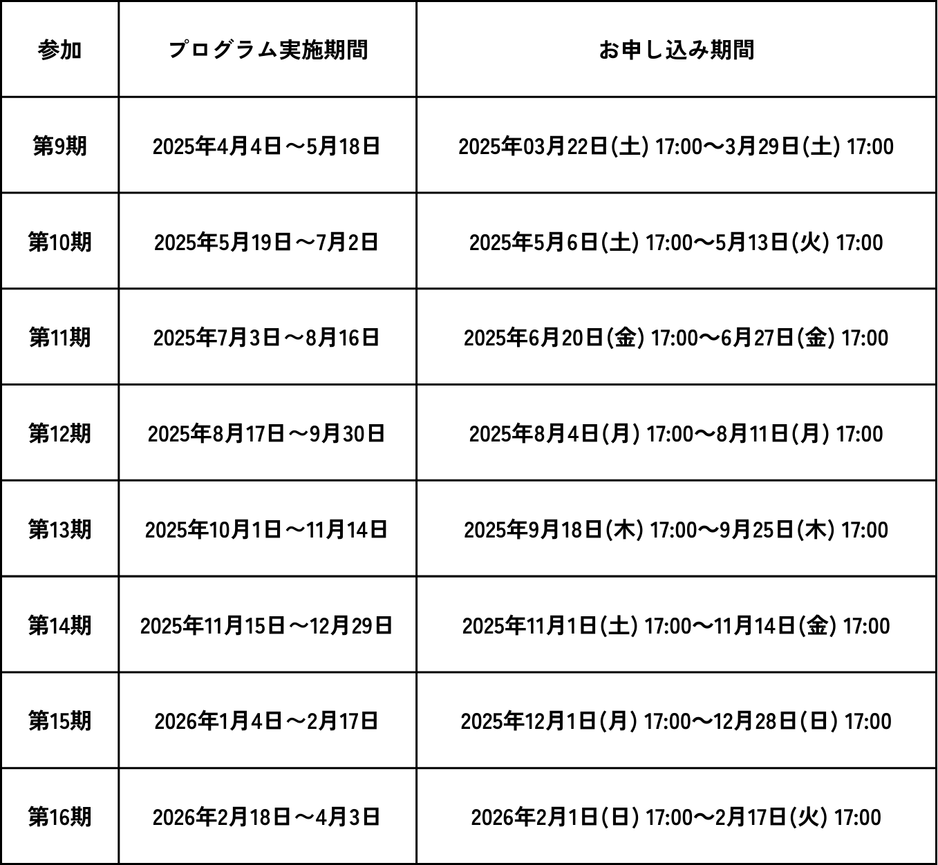 参加者全員同じタイミングで一斉に進めていくプログラムのため、プログラム開始のタイミングがずれてしまうと、過去のフェーズのコンテンツは見ることができない可能性があります。プログラムに遅れて参加することはできませんのでご注意ください。