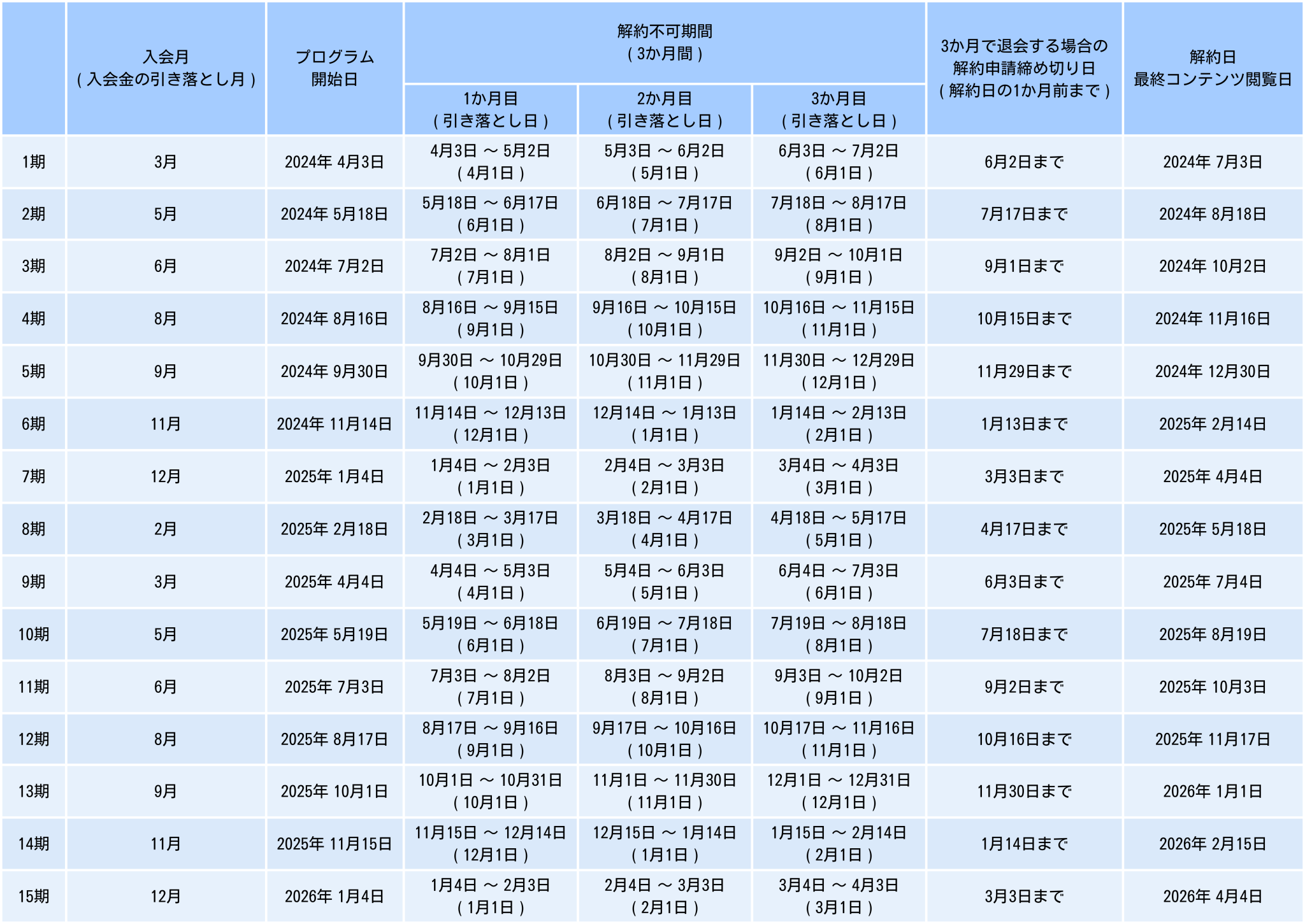 3か月で解約(プログラム開始日から3か月後)をご希望の場合は、以下の早見表でご確認ください。